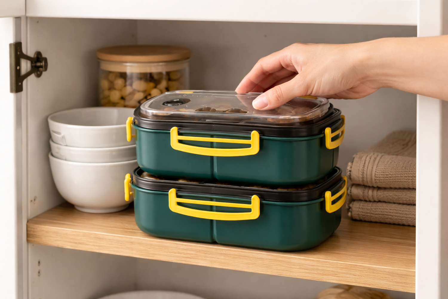 Le Bento est conçu de manière compacte et empilable, ce qui le rend facile à ranger dans n'importe quel espace de cuisine ou sac à lunch.